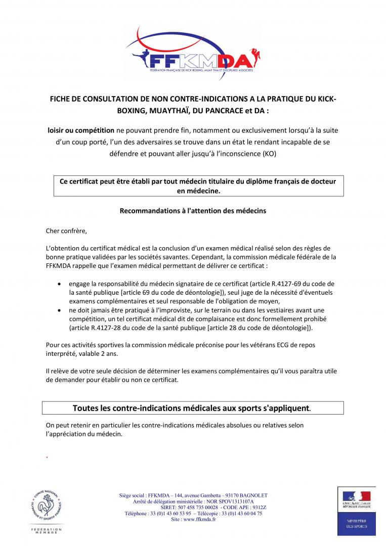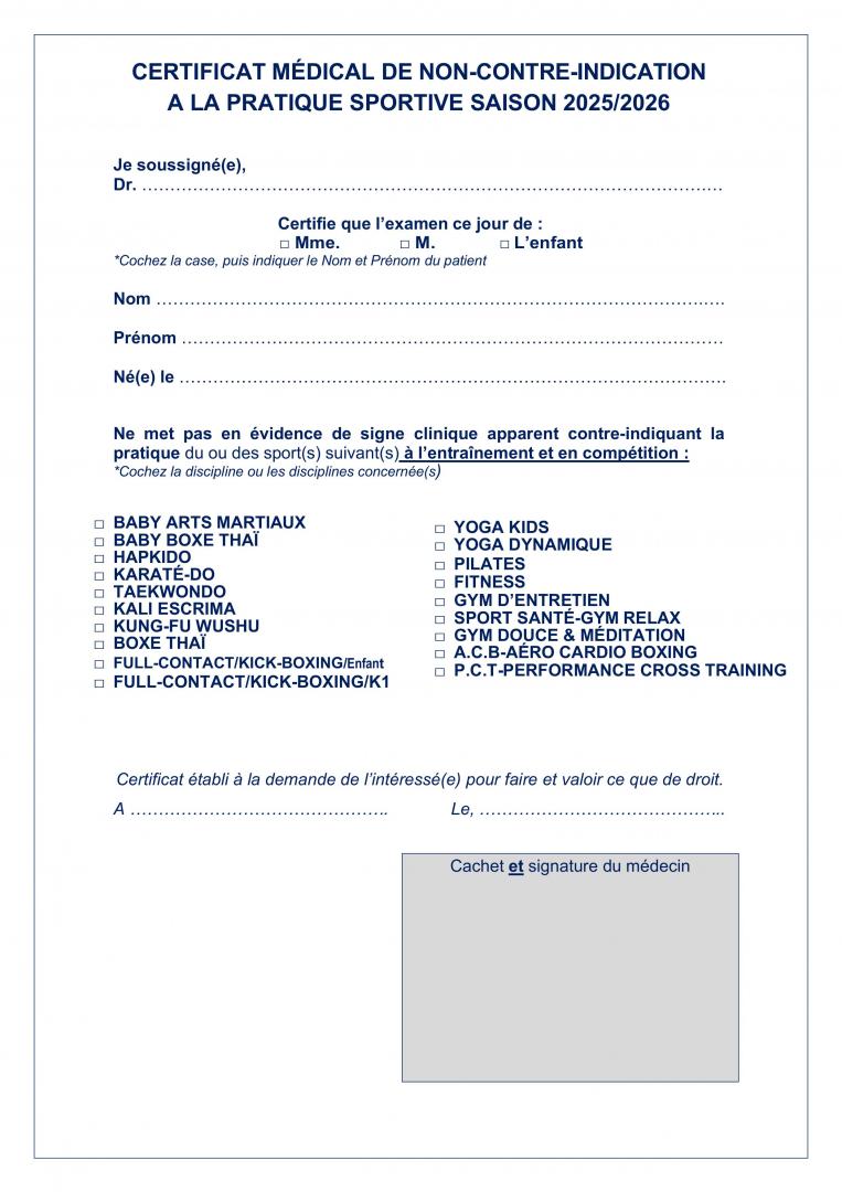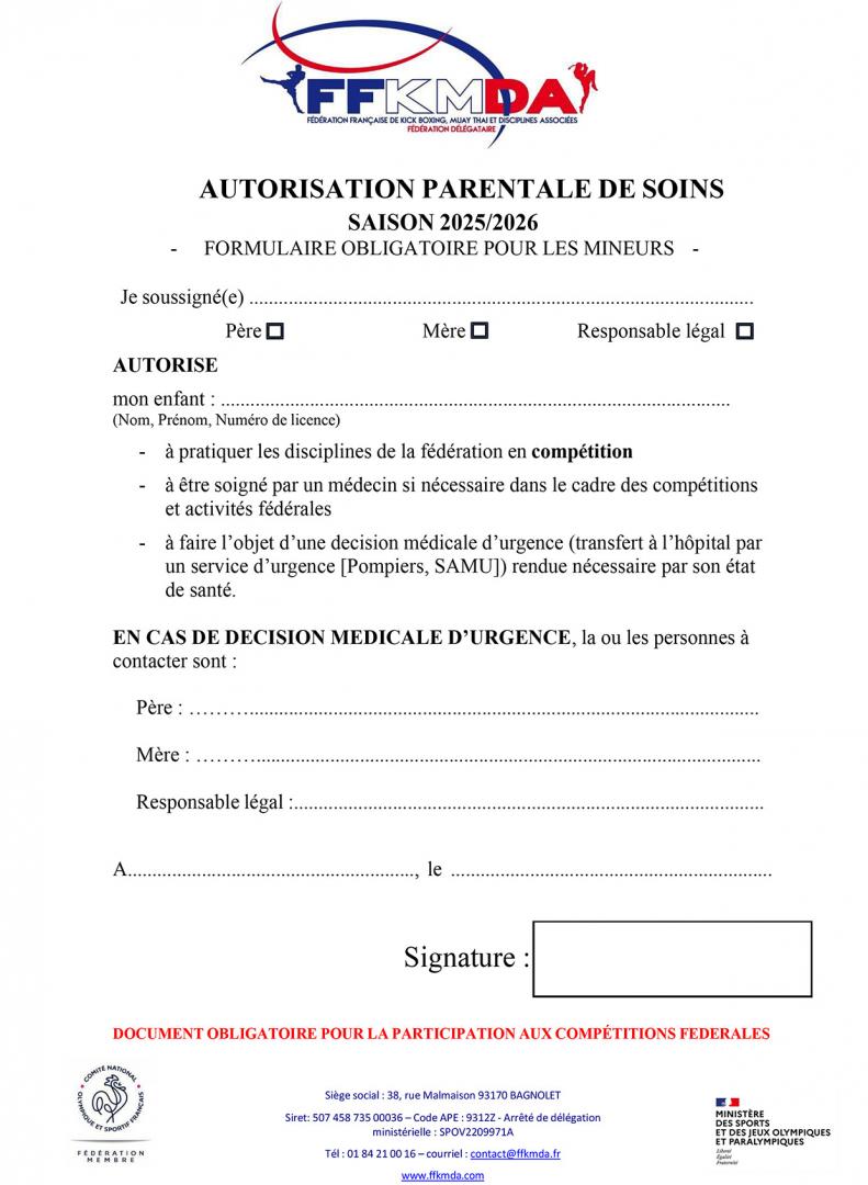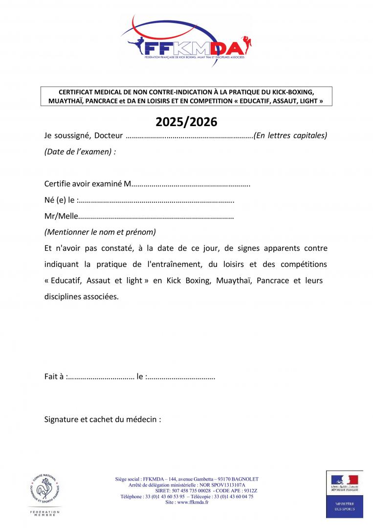 - Certificat médical officiel FFKMDA (section boxe) – obligatoire pour la saison 2025/2026 (établi à partir du 1er septembre 2025) - Autorisation de soins en compétition (pour les mineurs).