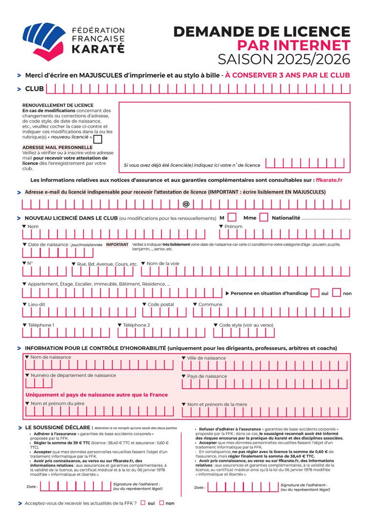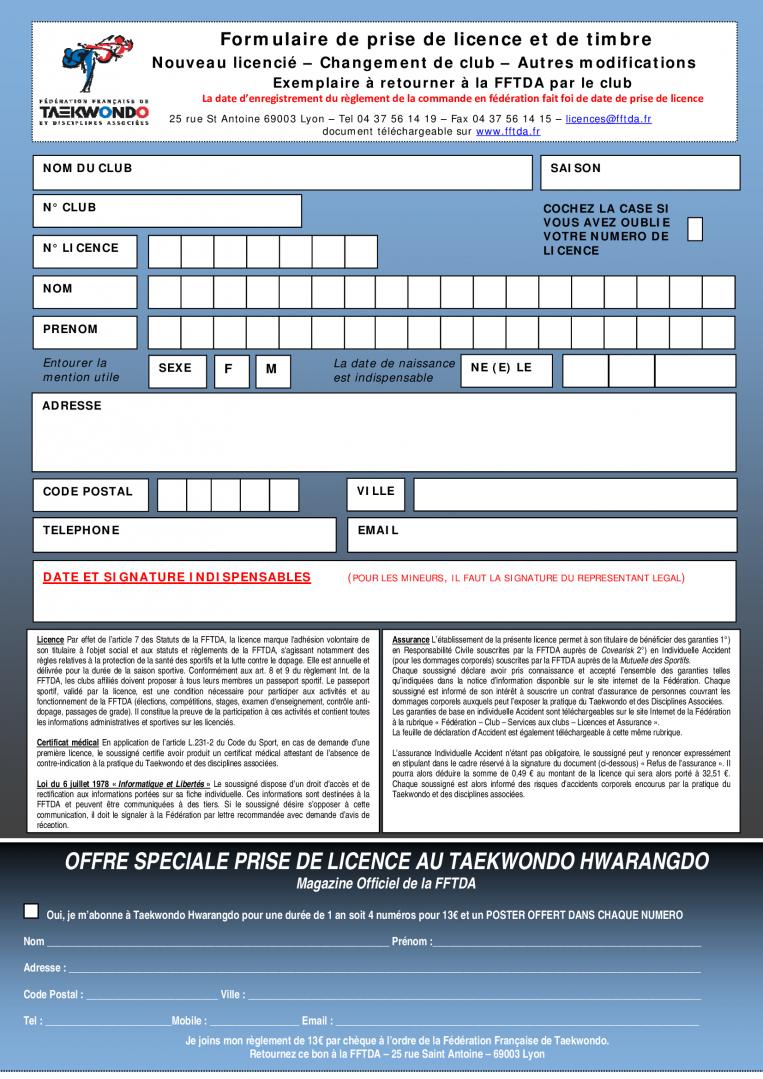 - Formulaire de demande prise de licence : Karaté - Taekwondo - Kung-fu